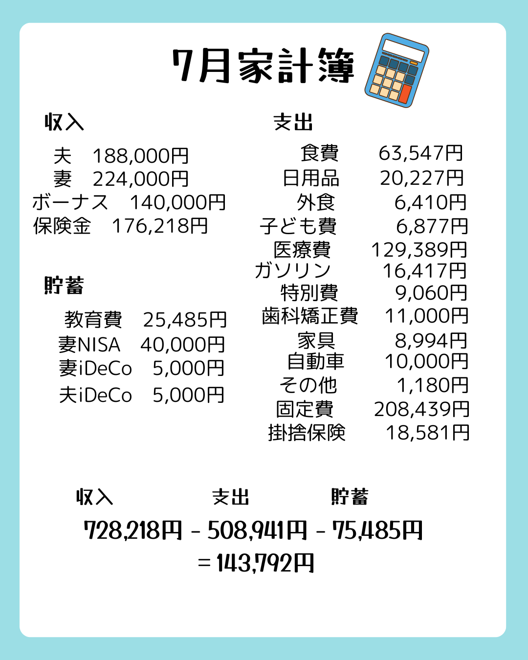 (夫 188,000円+妻 224,000円+ボーナス 140,000円+保険金 176,218円) - 支出合計:508,941円
