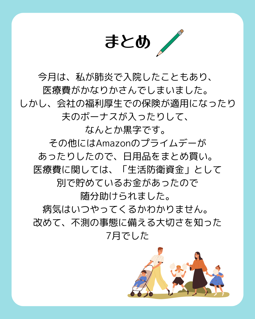 今回改めて、「医療保険+制度+貯蓄」の3本柱があれば、家計は守れると実感しました。